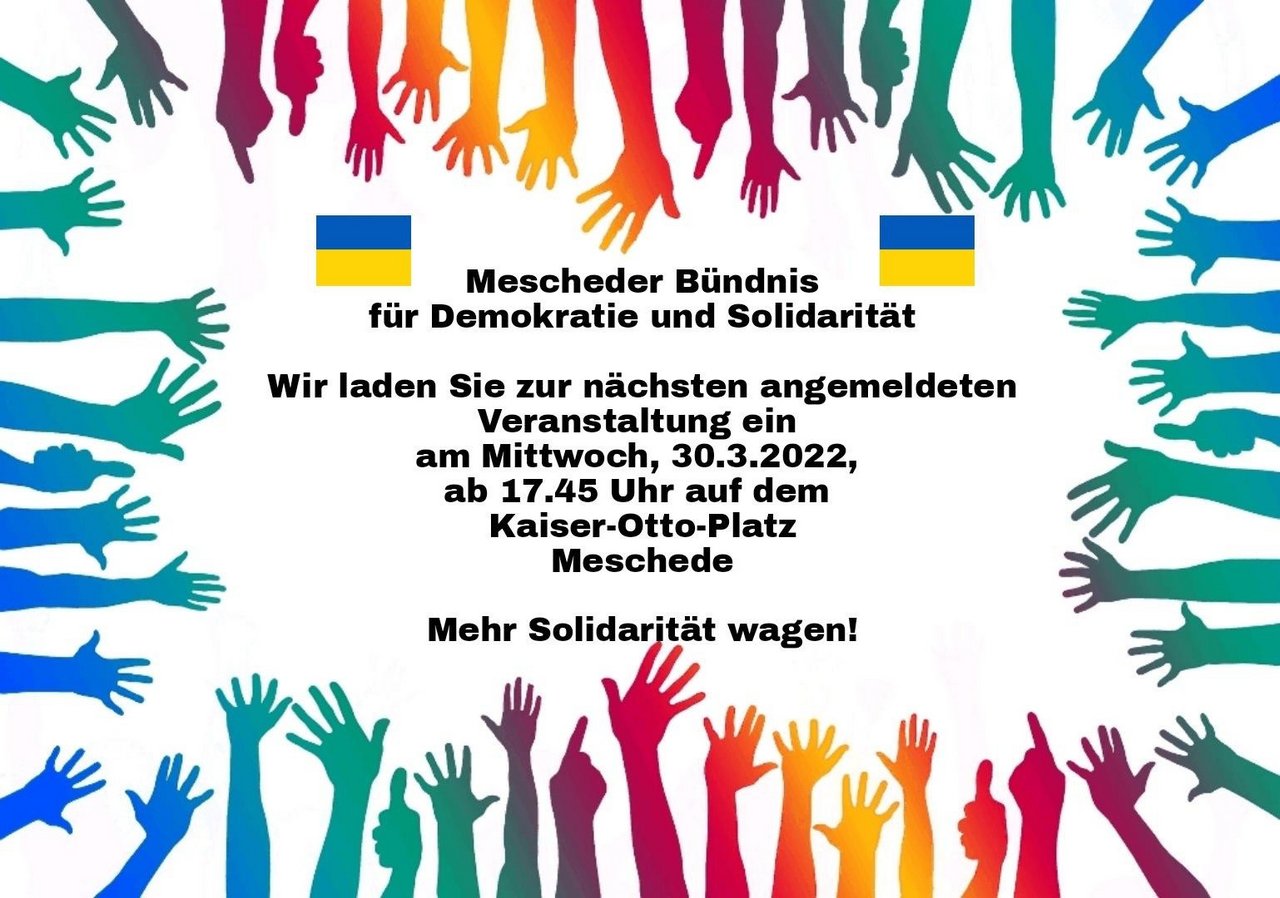 Das „Mescheder Bündnis für Demokratie und Solidarität“ lädt alle Mitbürgerinnen und Mitbürger für kommenden Mittwoch, 2.3.2022 ab 17.45 Uhr wieder zu einer angemeldeten Versammlung auf dem Kaiser-Otto-Platz Meschede ein. Angesichts der aktuellen Lage und der Bedrohung der Demokratien in Osteuropa soll das Treffen dieses Mal still und ohne Ansprachen stattfinden.